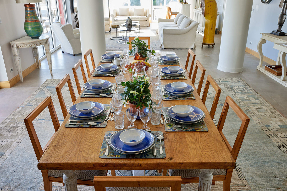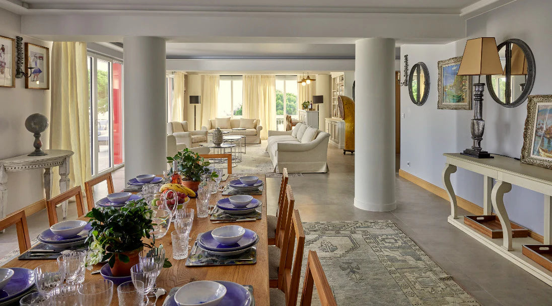 Along the second bay window, at the edge of a large terrace, we have set up the dining room. Here too, the space offers a panoramic view of the beach and the sea. We aimed to create a sense of extension between the space and its direct outdoor environment while fully enjoying its sunlight.