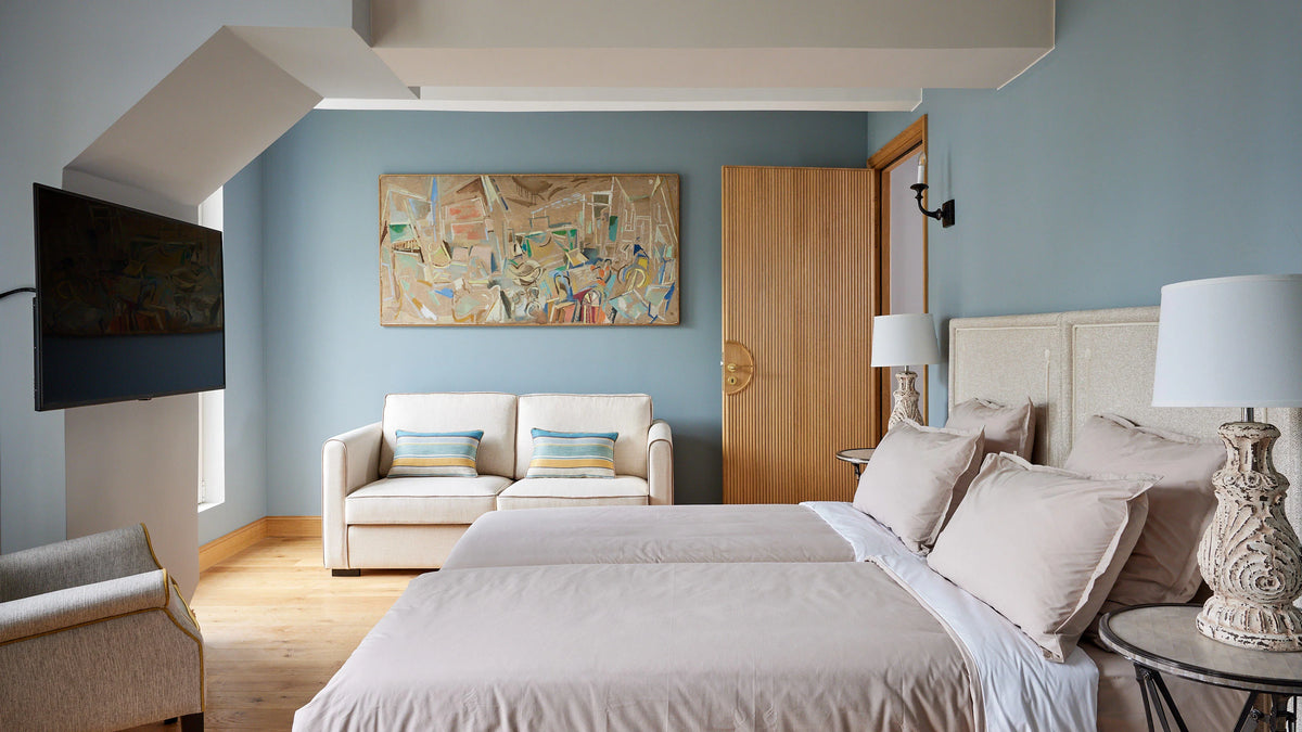 To make them welcoming and relaxing, we used soft and comfortable materials, and furniture with a clean and elegant design. For example, the Ecouen bench and the Chelsea upholstered chair decorate one room, while the Charles and Du Bac armchairs face each other in another. In the third room, we installed a Long Island sofa in sand color and a Victor armchair. Behind each bed, the color of the Igor headboard varies to match the wall shade. We also included Languedoc upholstered end tables with drawers and Lauris side tables. Their understated and elegant style enhances the serene atmosphere and invites relaxation.