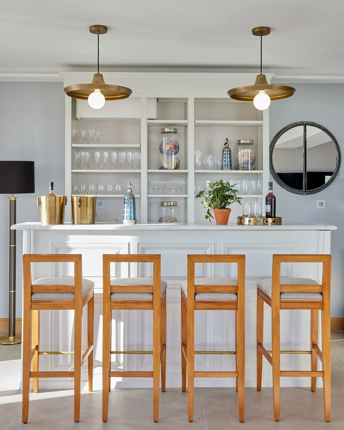 In the evening, the Milan brass pendant lights warmly illuminate the area above the counter, and the subtle lighting from the Ronda lamp, placed behind the bar, further enhances the cozy atmosphere.